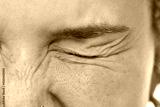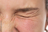 Closeup of woman’s wrinkled eye area while squinting, natural skin texture, studio shot on white background.