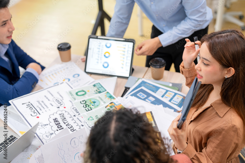 In a modern office, a diverse team of financial tech startup professionals gathers for a business strategy meeting, actively brainstorming innovative solutions, analyzing data, and discussing growth o