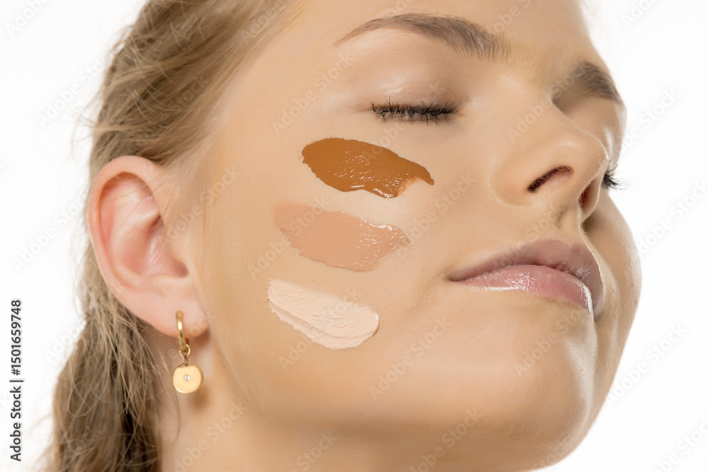 Close-up portrait of smiling young woman with different foundation shades swatched on her cheek, demonstrating makeup color matching process against white background