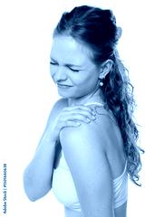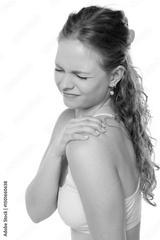 Young woman in white top grimacing with eyes closed while touching shoulder, demonstrating joint pain or muscle tension against clean white background