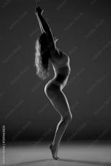 Dramatic silhouette of woman in white underwear stretching upward on tiptoes with raised arms, showcasing elegant body contours against dark background