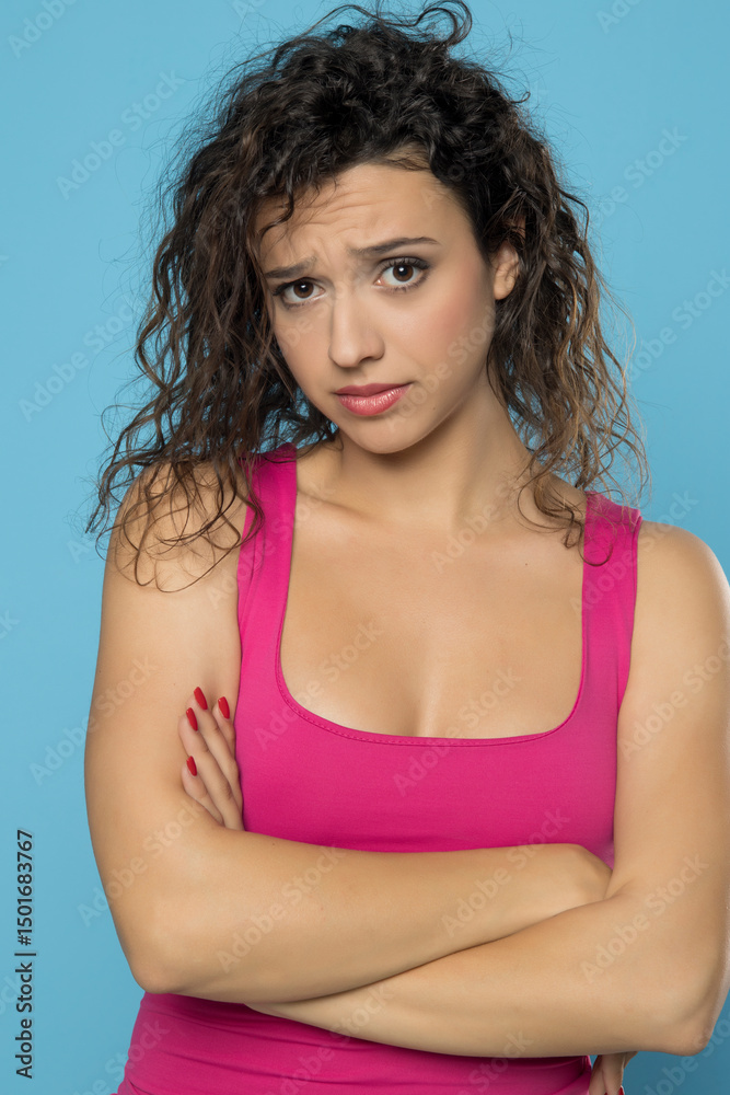 Sad and questioning young woman with curly hair and crossed arms, wearing a pink top against a blue background