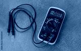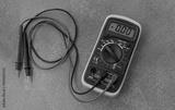 An electronic multimeter with wires and probes on the table. A device for measuring voltage.