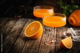 Fresh organic orange drink or cocktail in a glass cup with an orange slice on a wooden table.