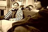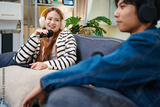 Podcast conversation between young man and woman with headphones and microphones