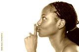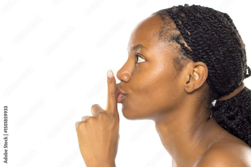 Black woman in profile view making "shh" gesture with finger on lips, studio shot on white background.
