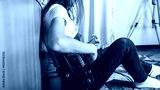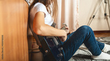 Young caucasian brunette woman sitting on floor and playing electric guitar at home