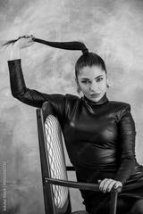 Striking woman with long dark hair in a high ponytail poses confidently in a black leather dress, seated on a vintage chair against a textured grey backdrop