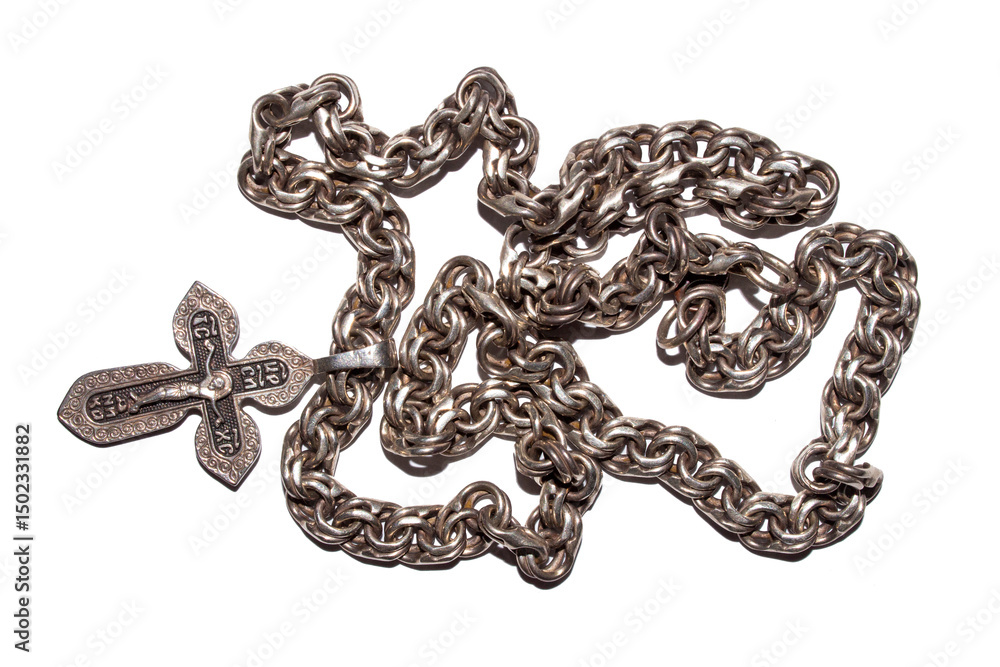 Save and preserve a silver cross with a chain on a white background.Orthodox church silver cross.A silver chain.A cross with Jesus Christ.