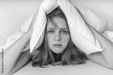 Woman in bed covering ears with pillow because of noise