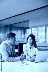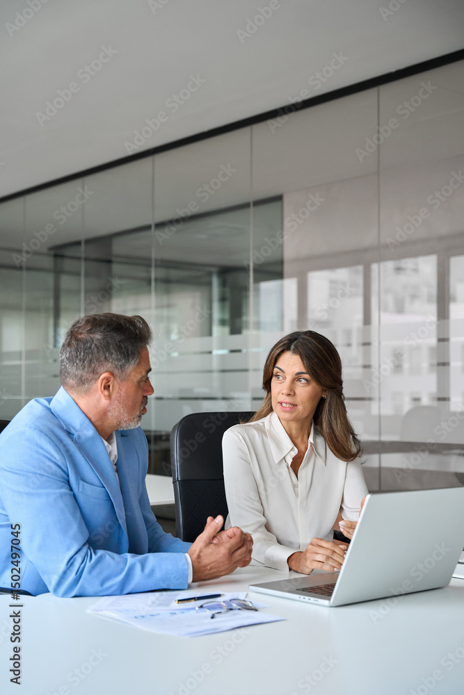 Two busy professional business man and woman executives team using laptop working on computer having conversation on financial project in office. Bank manager consulting client at meeting. Vertical