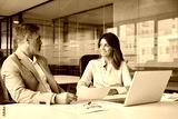 Two happy busy middle aged professionals man and woman business leaders partners checking document financial report talking working together on laptop computer in office at corporate meeting.