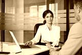 Busy mature business woman professional bank manager lawyer consulting client on finances management. Two older executives team business people man and woman working at office corporate meeting.