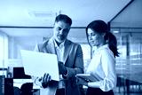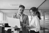Busy professional smiling businessman and businesswoman leaders having conversation at work. Executives team of two business people working talking using laptop technology standing in corporate office