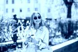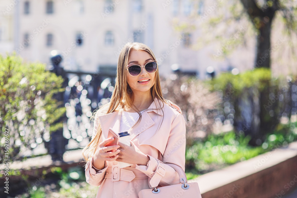 Upper class woman . Fashionable woman texting outdoors. Fashion woman in a sunglasses and pink jacket with coffee