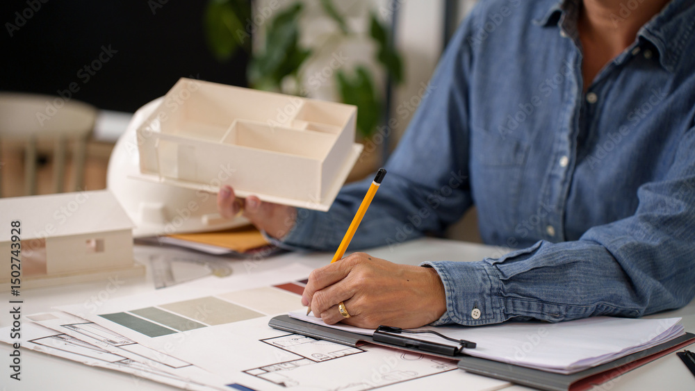 Architect Hand Drawing Blueprint for House Design Ideas Asian Women Design Sketches with Pencil Model on Table for Home Renovation Projects House Blueprint Design