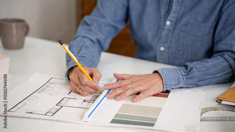 Architect Hands Drawing Blueprint with Ruler and Pencil, Adult Person Design Home Interior Plans, Blueprint for Renovation Project Idea Architect Hands Design