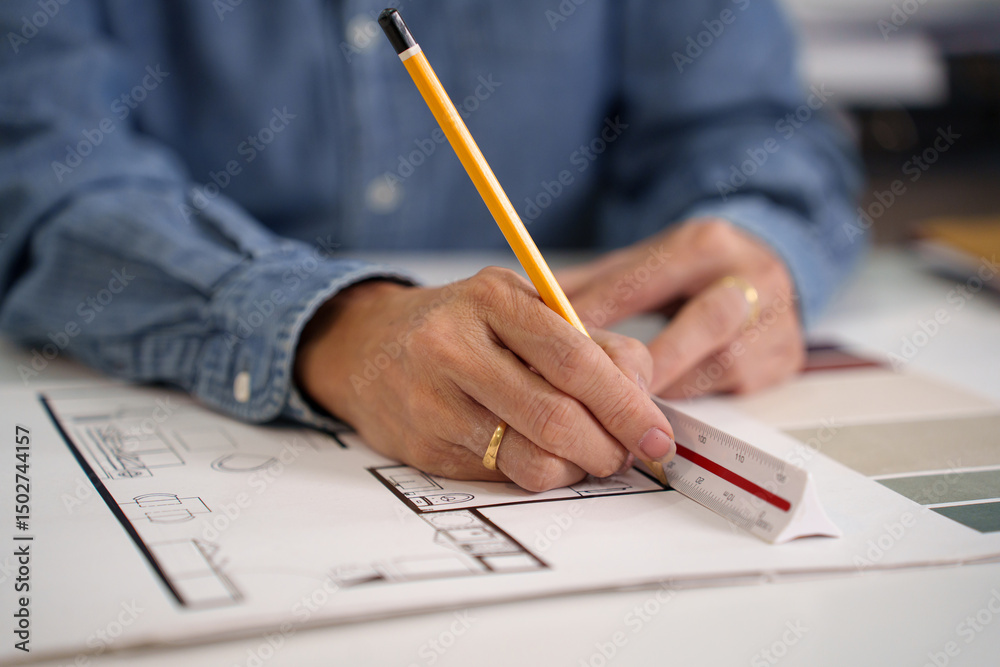 Architect Hands Drawing Blueprint Design with Pencil and Ruler Older Asian Hands for Home Construction Planning Design