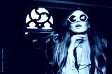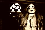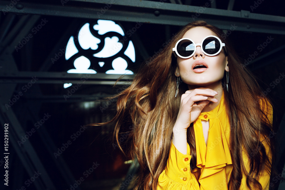 Close up indoor portrait of young beautiful fashionable woman with long hair. wearing stylish round sunglasses, yellow blouse. Model looking up. Female fashion concept. Copy, empty space for text