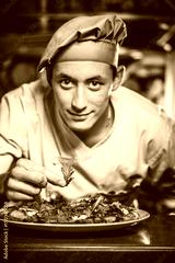 Food concept. Preparing traditional italian pizza. Young handsome chef in white uniform and gray hat decorate ready dish with green rucola herbs in interior of modern restaurant kitchen. Ready to eat.
