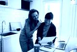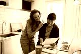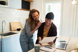 Lesbian couple reviewing finances together at kitchen counter with laptop and bills
