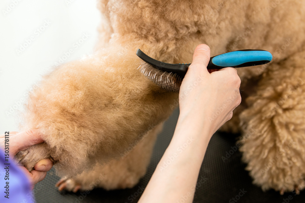 Groomer Brushing Poodle's Fluffy Coat with Care