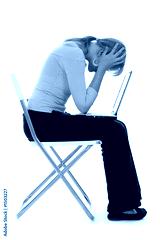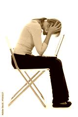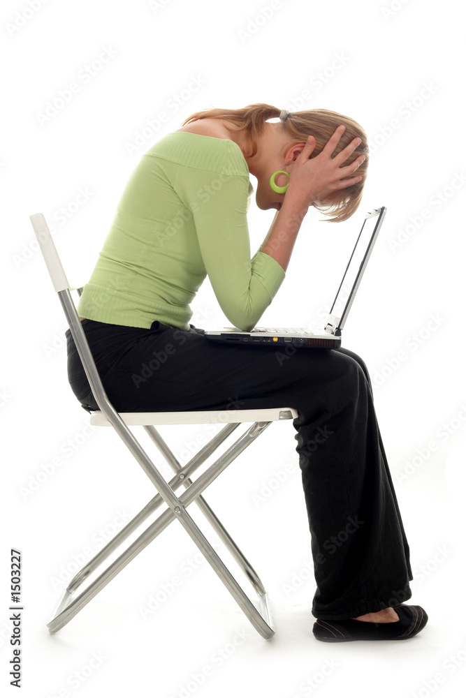 young woman with laptop, holding head in hands