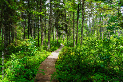 Wooden boardwalk allowing hikers to move through a magnificent wetland environment