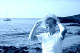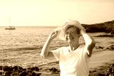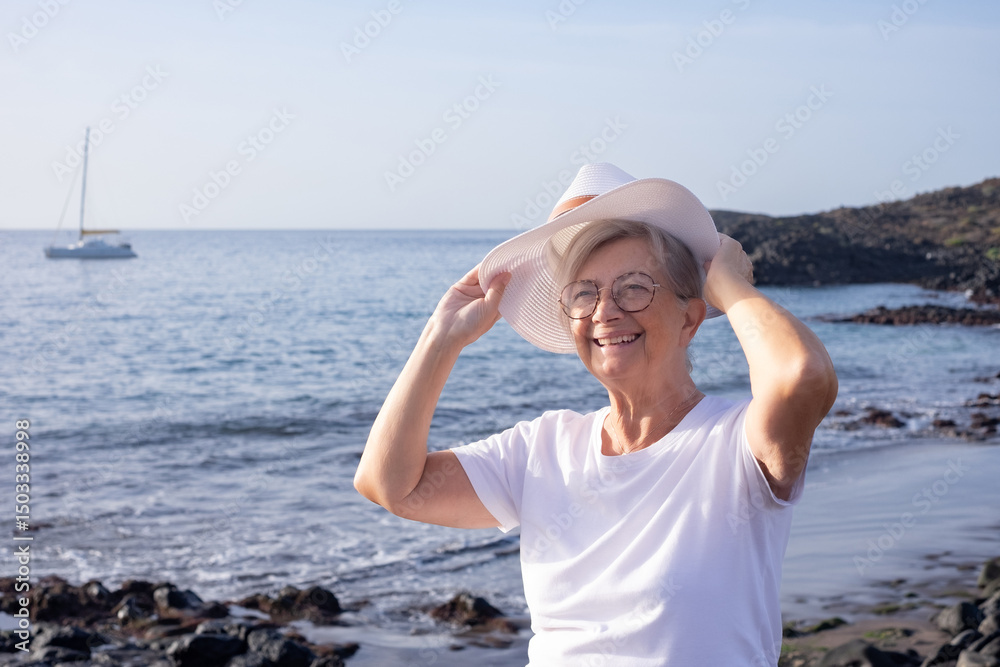 Smiling carefree senior woman holding a white summer hat sitting at the sea beach enjoying freedom, vacation and peaceful retirement lifestyle