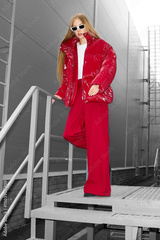 High fashion photo of a young blond woman in red glossy down jacket, pants, white top and sunglasses.