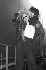 High fashion photo of a young blond woman in red glossy down jacket, pants, white top and sunglasses.