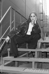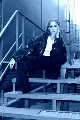 High fashion photo of a young blond woman in red glossy down jacket, pants, white top.