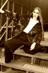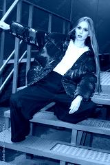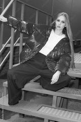 High fashion photo of a young blond woman in red glossy down jacket, pants, white top.