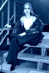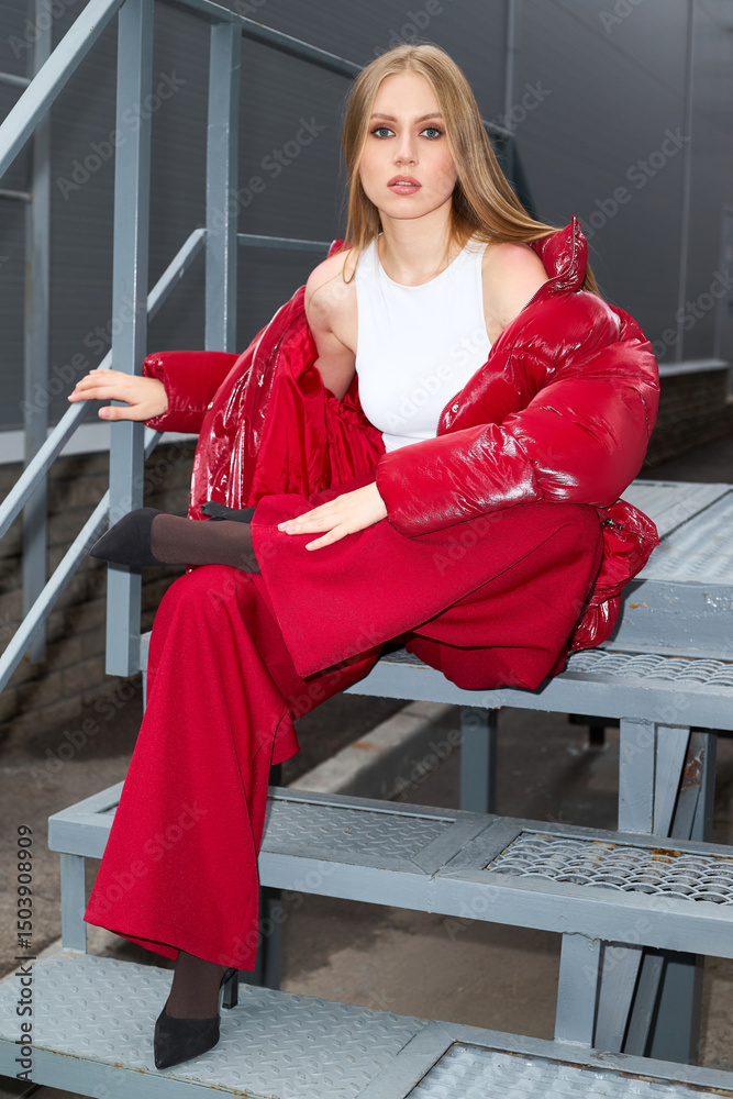 High fashion photo of a young blond woman in red glossy down jacket, pants, white top.