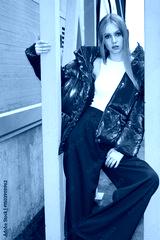 High fashion photo of a young blond woman in red glossy down jacket, pants, white top.