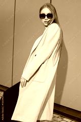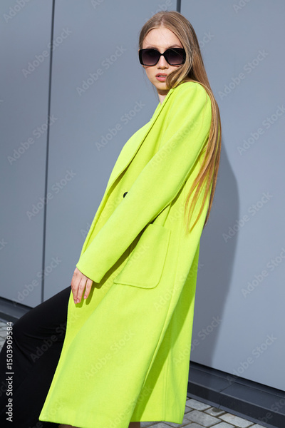 High fashion photo of a young blond woman in light green vivid coat, black dress, and sunglasses. Trendy fashion outfit.