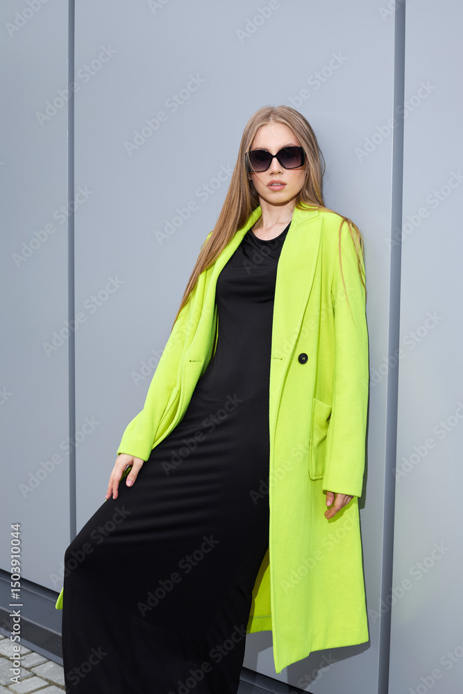 High fashion photo of a young blond woman in light green vivid coat, black dress, and sunglasses. Trendy fashion outfit.