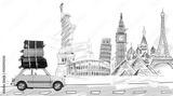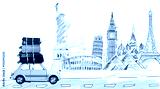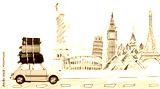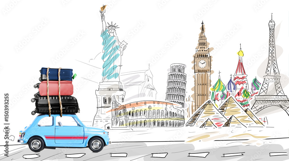 Around the world. Blue retro toy car with travel cases driving by famous monuments.