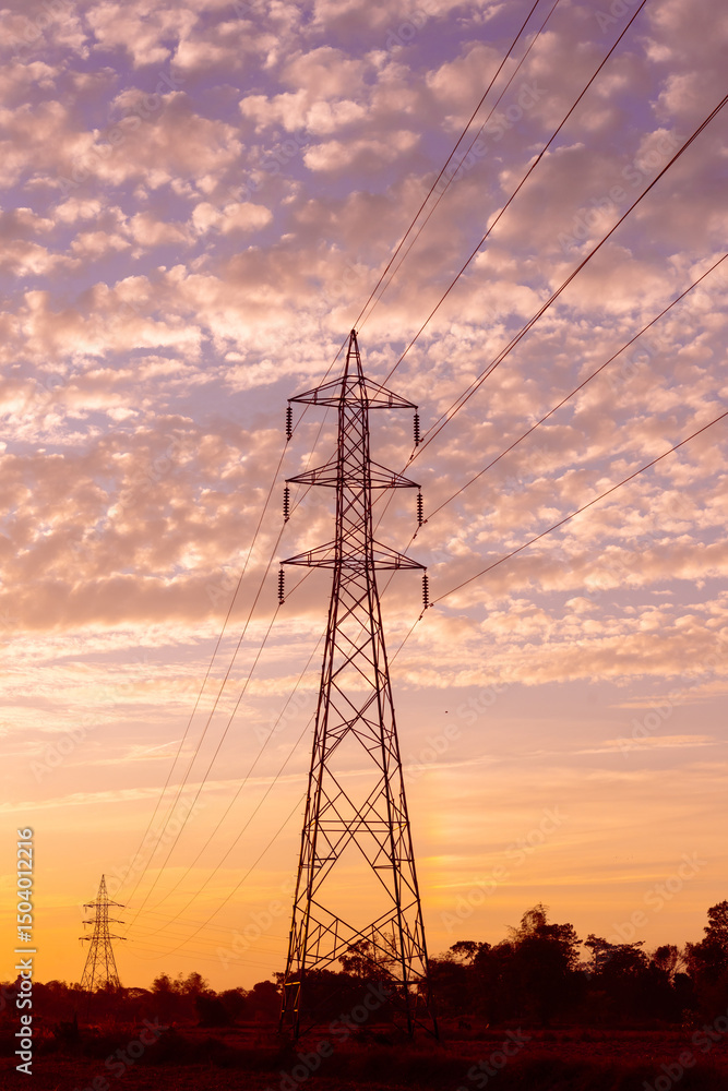 Electric pole on sunset background. Sunset over power lines. Clean energy High voltage electric tower . Power tower