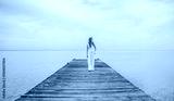 Asian woman standing barefoot on a wooden pier, gazing into the distance over a calm sea horizon, dressed in a white outfit under a pale cloudy sky, mindfulness, wellness retreat, travel blog