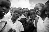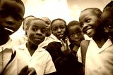 Real photo of happy black African kids in school uniforms, smiling and enjoying a break. A positive image of youth, education, diversity, and community spirit.