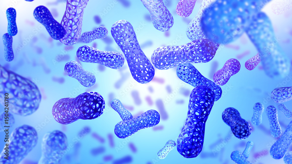 Probiotic background. Bifidobacteria in human body. Probiotic cells under microscope. Lactobacilli to improve digestion. Scientific background. Probiotic molecules. Microbiota for stomach. 3d image