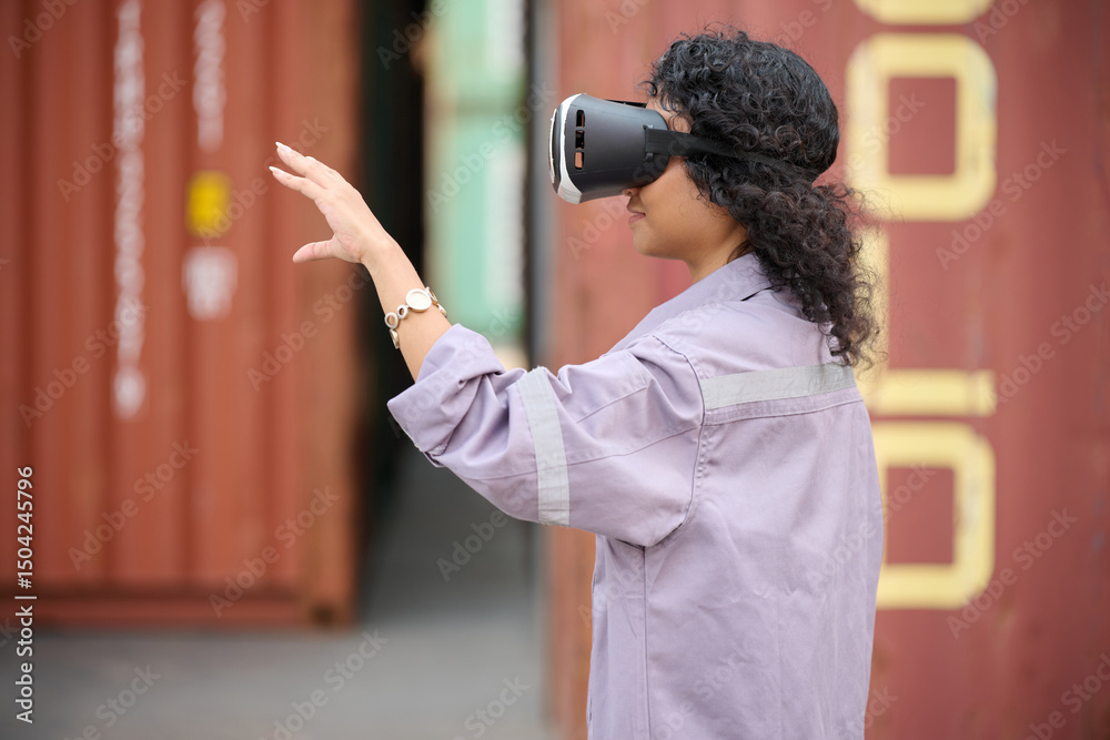 Engineer or worker wearing virtual reality glasses(VR) in containers warehouse storage