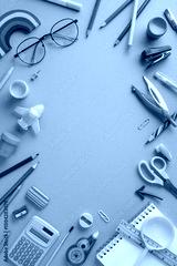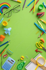 A vertical collection of vibrant school materials including pencils, scissors, and a rainbow decor situated on a green backdrop, symbolizing education, creativity, and learning