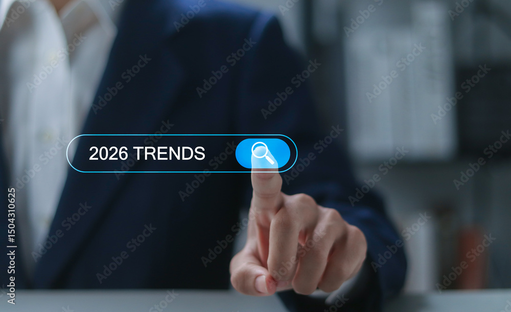 Businessman touching to search bar with 2026 trends on virtual screen for business and fashion in new year concept.