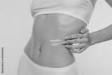 Close-up of slim torso in white underwear with hand applying moisturizer on stomach, showing navel piercing against beige background.