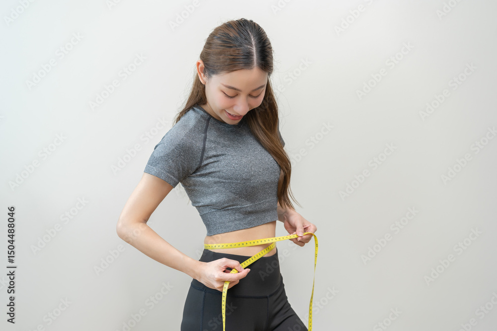 Diet, slim shape asian young woman, female standing, hand using measure tape around waist, body. Happy girl slim slender isolated on background. Diet session for wellbeing health, eat good food people