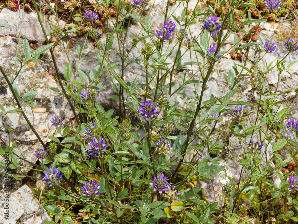 Bituminaria bituminosa | Arabian pea or pitch trefoil, mediterranean herb producing pretty pinkish mauve flowers atop tall stems with trifoliate, long and elliptic green leaves smelling tarry