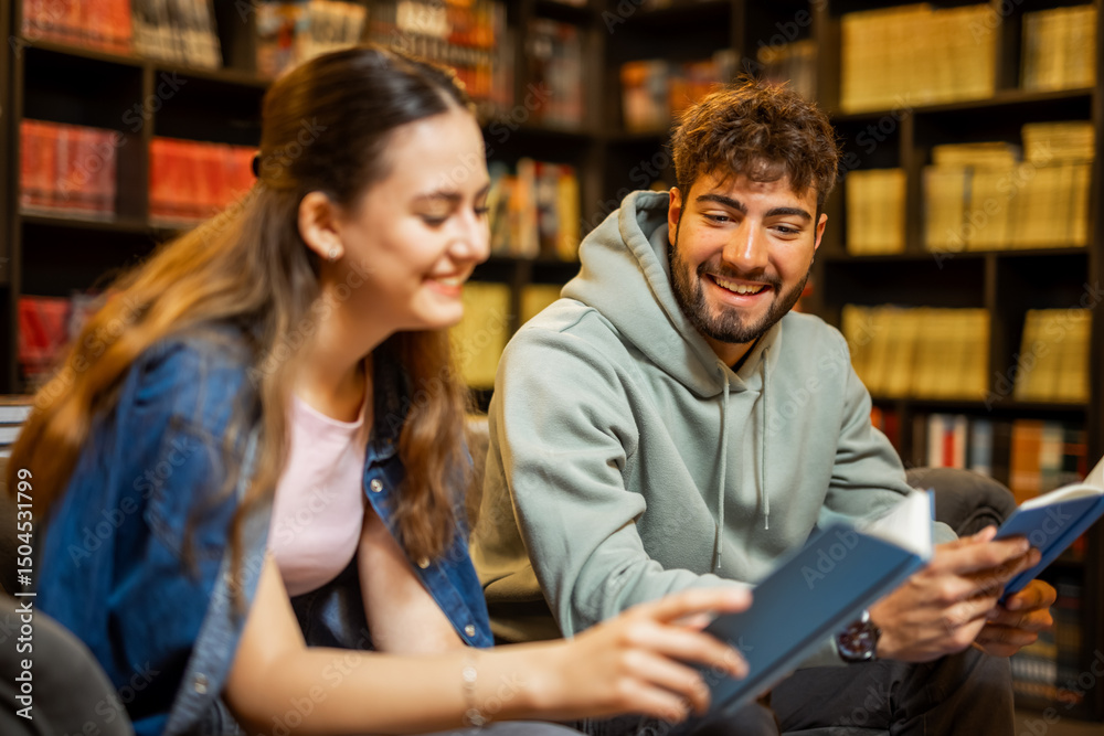 Two Students Studying and Reading Books in Library