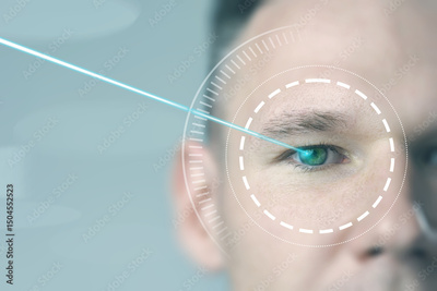 Focused light beam targeting human eye for advanced vision correction technology in a clinical setting